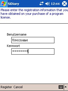 Please enter your username and password from SiDiary-Online, taking care to enter them accurately (uppercase and lowercase characters are important), then click on 'Register' to complete the process: